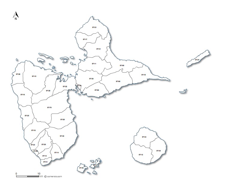 Carte personnalisable des codes postaux de la Guadeloupe pour l'infographie, l'édition et l'impression grand format.