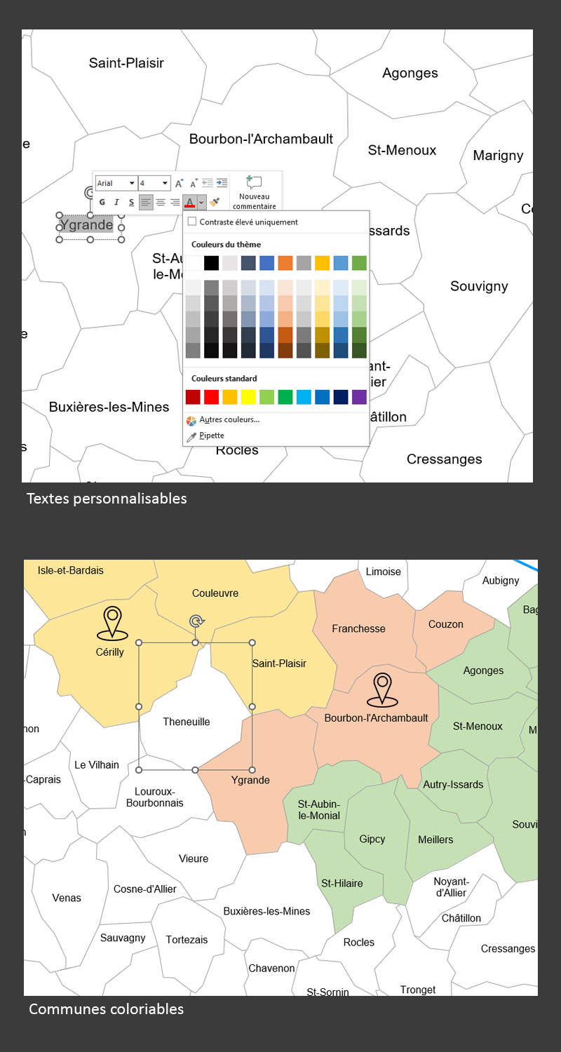 Chaque commune est une forme graphique modifiable : couleur, ligne,