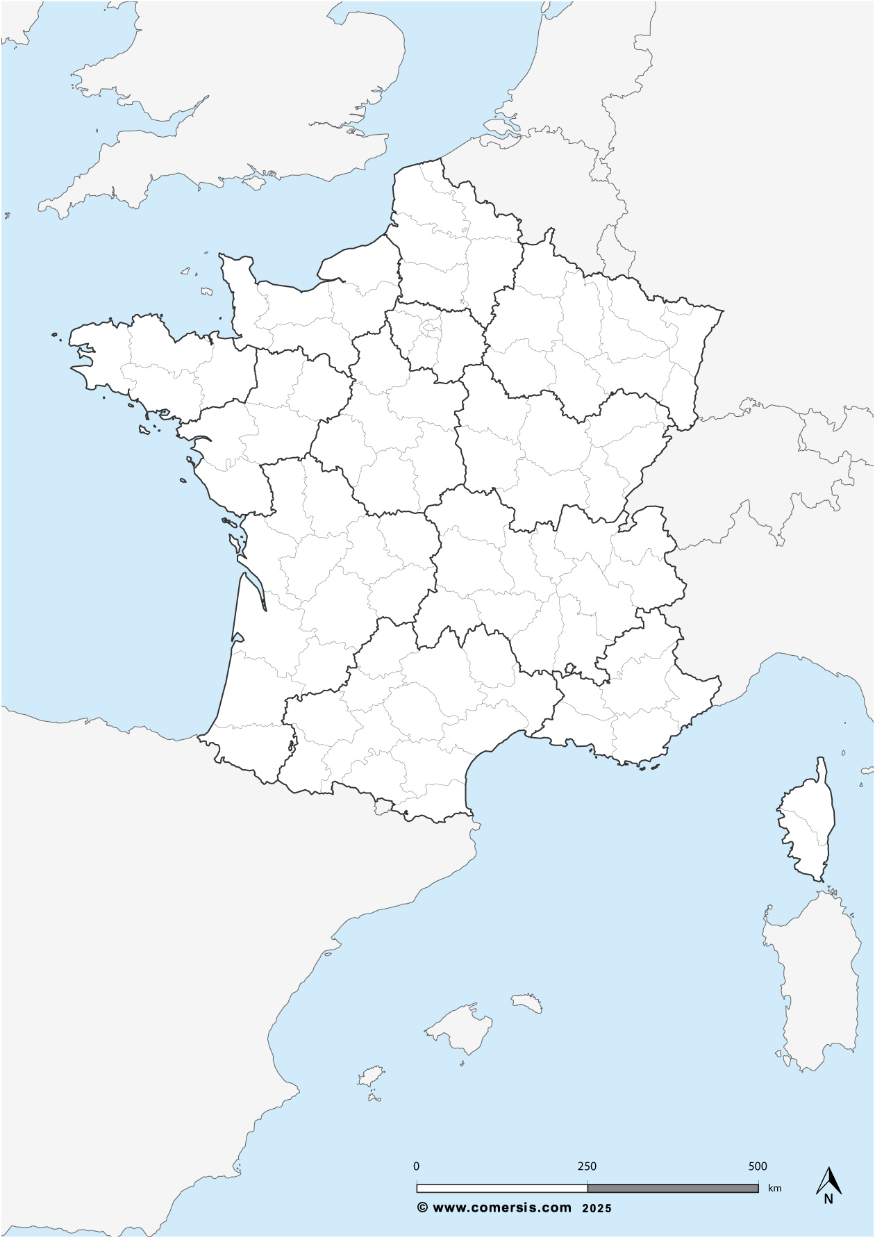Free customizable map of the new regions and departments of metropolitan France.